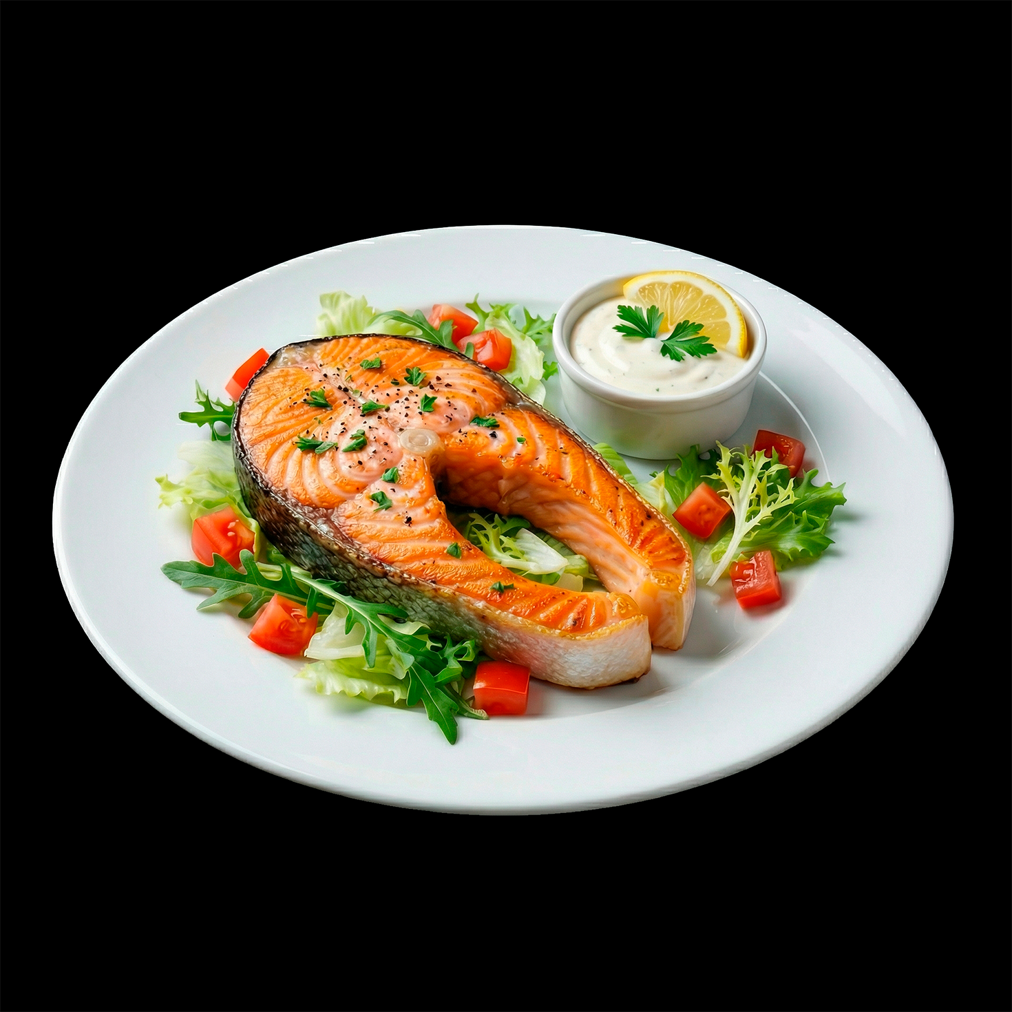 Сочный стейк благородной кеты, обжаренный до идеальной румяной корочки с сохранением нежной текстуры внутри – это настоящий деликатес для ценителей качественной рыбы! Приправленный лишь солью и черным перцем, он раскрывает натуральный богатый вкус красной рыбы, а подача на подушке из свежих листьев салата с сочными томатами черри и нежным сливочным соусом делает блюдо изысканным и завершенным. Источник полезных Омега-3 жирных кислот и белка – это не только вкусно, но и невероятно полезно!
