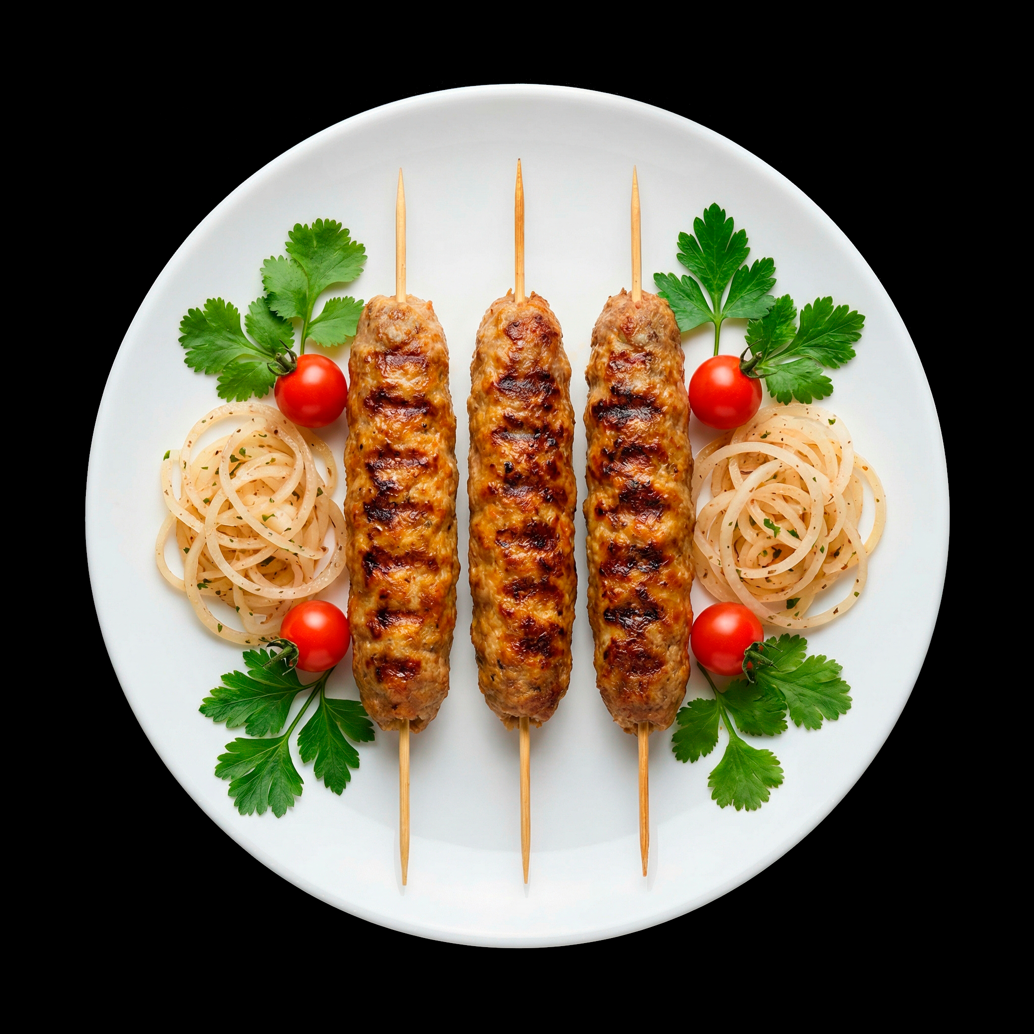 Люля-кебаб — сочные колбаски из рубленого говяжьего фарша с луком, кинзой и ароматными специями, приготовленные по традиционной восточной рецептуре. Каждая люля вымешана вручную до идеальной плотности и обжарена на мангале или сковороде-гриль до аппетитной корочки с дымком.