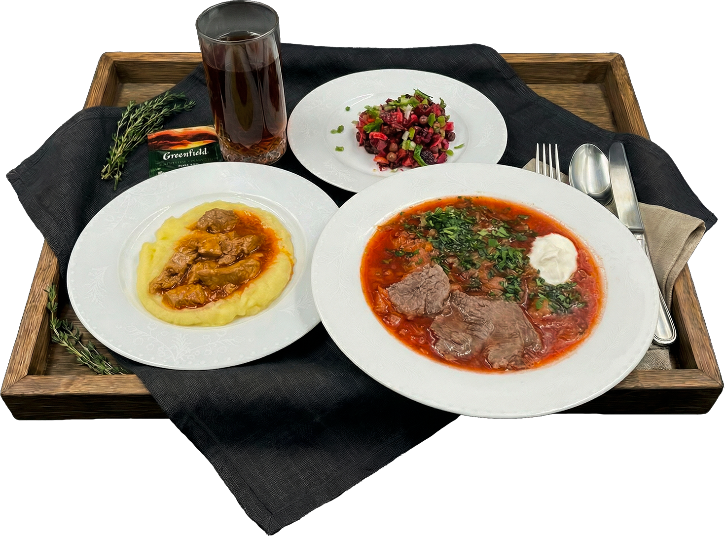 Пятница — финишная прямая, и мы подготовили для вас идеальный обед! 🎉 Наваристый борщ, нежное пюре с ароматным гуляшом и полезный винегрет — всё, что нужно для заряда бодрости перед выходными. Чашка чая Гринфилд поставит вкусную точку в рабочей неделе. Вы справились — пора отдыхать и наслаждаться! 🌟 ☕