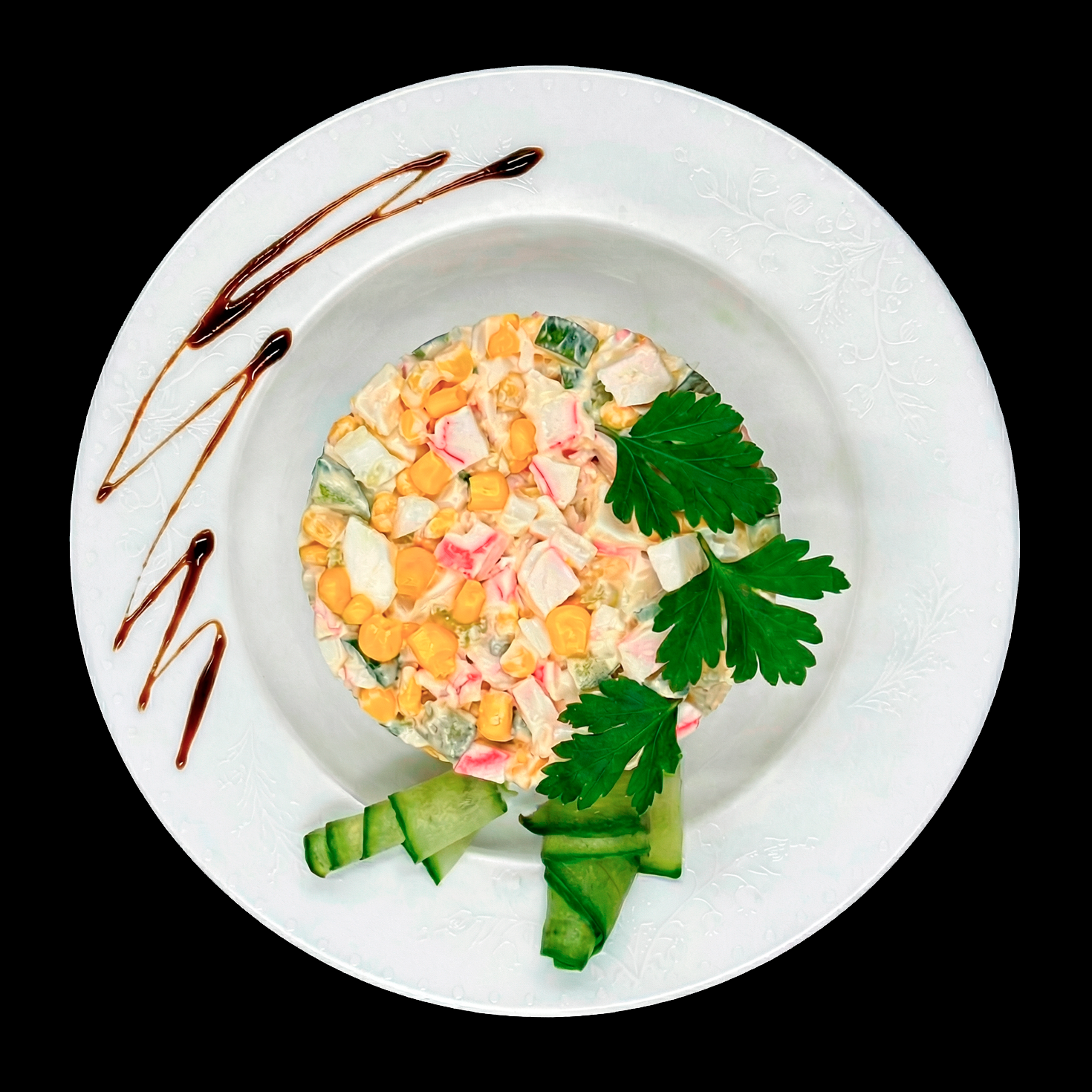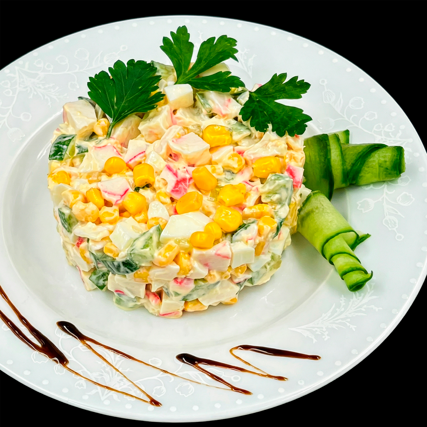 Хит любого застолья, перед которым невозможно устоять! Сочные кусочки крабового мяса, сладкие зёрна кукурузы, свежий хрустящий огурчик и нежные яйца — всё это заправлено сливочным майонезом до идеальной консистенции. Идеален для праздника и будней — заказывайте и наслаждайтесь!