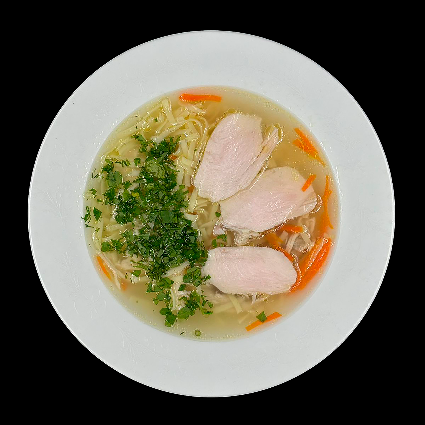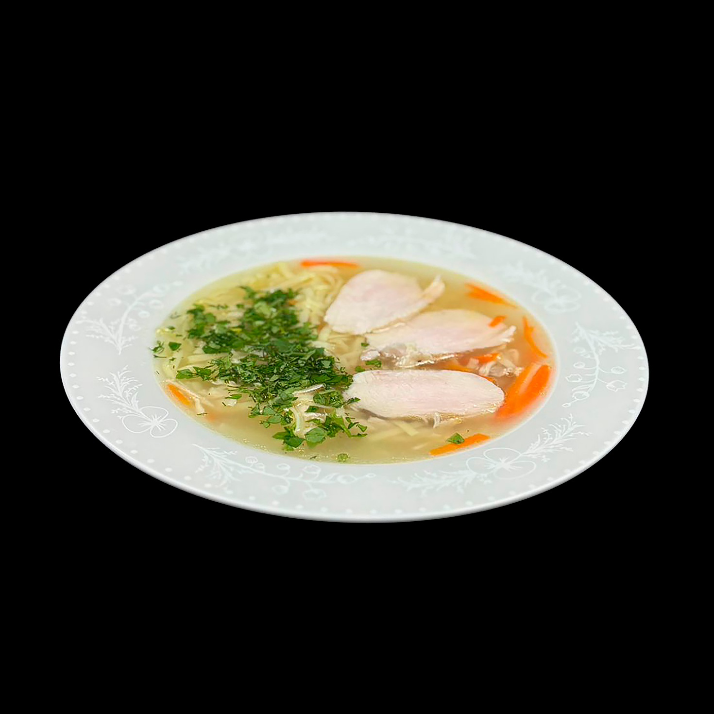 Домашний суп-лапша с курицей на наваристом курином бульоне – классика, которая никогда не выходит из моды! Нежные кусочки отварной куриной грудки, яичная лапша, сочная морковь и ароматная свежая зелень в золотистом прозрачном бульоне создают идеальное сочетание для сытного обеда. Всего 108 ккал, 12,2 г белка – закажите горячий суп-лапшу с доставкой от “Олеськины рецепты” и насладитесь вкусом домашнего уюта!